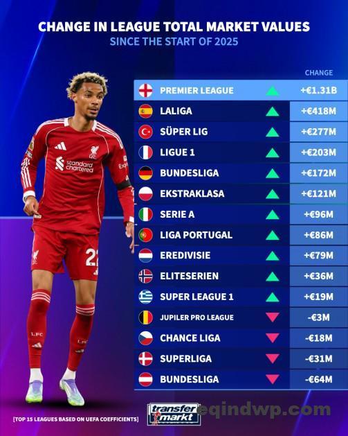 北京时间10月25日,德转统计出了欧洲15大联赛2025年球员总身价的涨跌榜,英超以增加超13亿欧元高居第一,西甲增加约4.2亿欧元第二,意甲为5大联赛涨幅最少的联赛,仅增加9600万欧元。