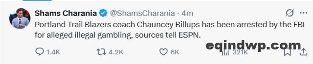 就在人们纷纷展望杨瀚森和开拓者的新赛季之旅时,波特兰方面却传来一则令人震惊的消息。根据查拉涅的报道,开拓者主教练比卢普斯因为涉嫌参与非法赌博,被FBI逮捕。据NBC率先报道,多位美国篮球圈内的名记也相继证实。