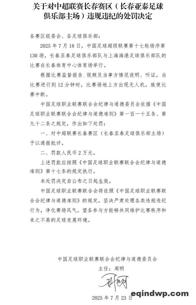 雷速体育7月24日讯 中国足球职业联赛联合会发布公告,长春亚泰足球俱乐部被罚款2万元,长春赛区被通报批评。 中 […]