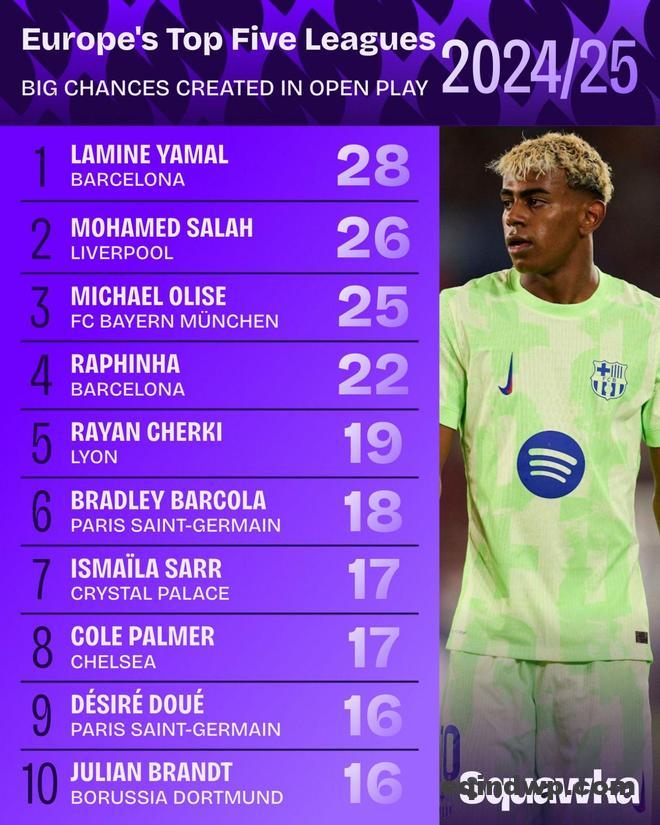 雷速体育9月7日讯 近日,数据公司统计了上赛季五大联赛球员在运动战中创造绝佳机会的次数。亚马尔、萨拉赫、奥利塞 […]