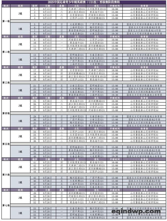 中足联官方公布了U21联赛晋级赛阶段赛程,比赛将于9月13日至9月29日期间在潍坊和呼和浩特两个赛区进行。