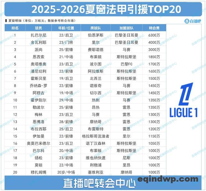 25/26赛季欧洲五大联赛夏窗关闭,法甲夏窗引援TOP10中,根据德转统计,巴黎新援扎巴尔尼以6300万成为标王,斯特拉斯堡占4席。