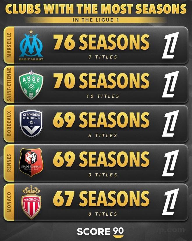 法甲参赛时长排行: 1、马赛,76个赛季,9冠 2、圣埃蒂安,70个赛季,10冠 3、波尔多,69个赛季,6冠 […]