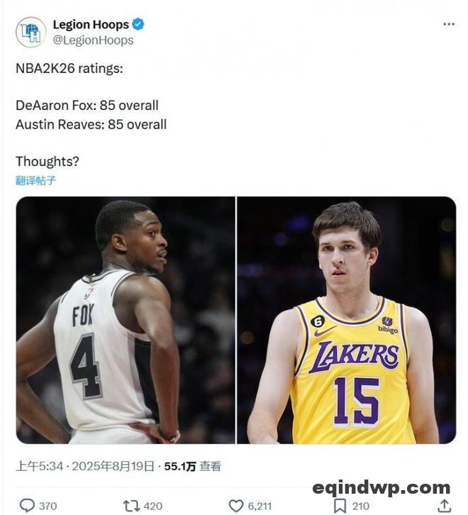 2K26官方更新了一波球员能力值,其中马刺后卫福克斯与湖人后卫里夫斯能力值同为85引发网友热议。