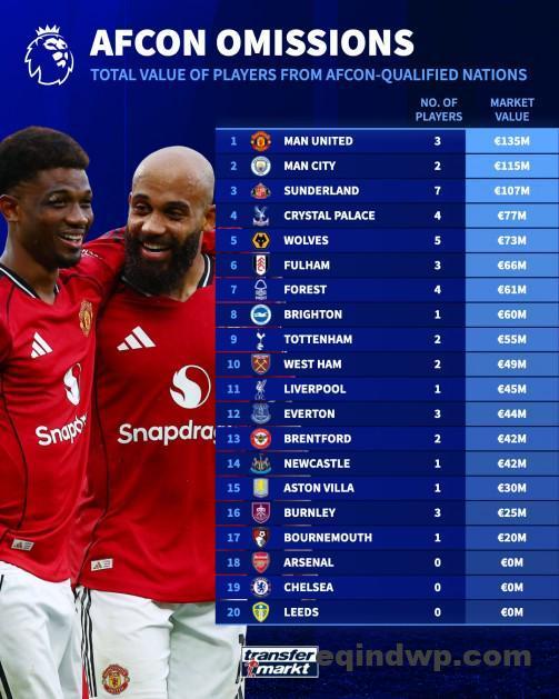 北京时间11月21日,德转列出英超20家俱乐部本届非洲杯晋级国家球员的总身价,曼联3人1.35亿欧元第一,曼城2人1.15亿欧元第二,桑德兰7人1.07亿欧元第三。