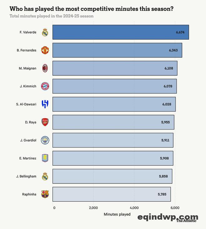 近日,TA发布了2024-25赛季在俱乐部与国家队中出场时间最多的球员排行,统计了各位球员在所有正式比赛中的累计出场时间,单位为分钟。