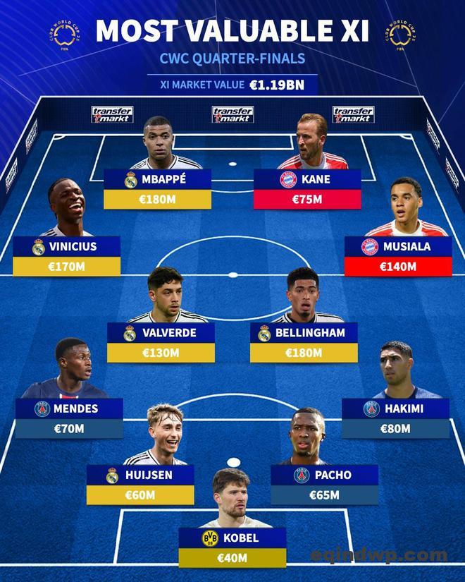 北京时间7月4日,德国转会市场列出了本届世俱杯1/4决赛最贵阵容。其中,姆巴佩1.8亿欧元,凯恩7500万欧元领衔锋线,维尼修斯、贝林厄姆、穆西亚拉、阿什拉夫等球星入列。