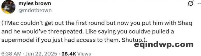 6月22日,NBA知名记者迈尔斯·布朗发文,针对此前麦迪称给他奥尼尔也能夺冠的话题,迈尔斯·布朗说:麦迪连季后赛首轮都没过去,竟然还说可以搭档奥尼尔,就可以得到三连冠,就像有人说只要给他机会认识超模,就可以追到手一样,闭嘴吧!
