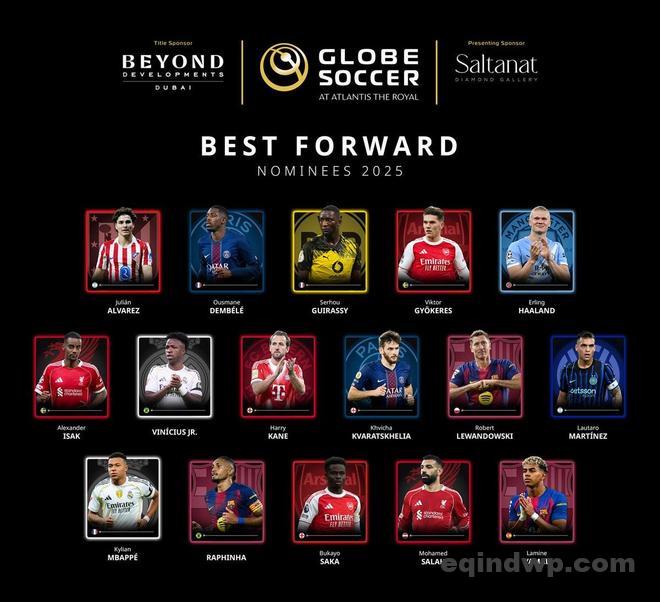 北京时间11月19日,环球足球奖公布了年度最佳前锋候选名单,其中哈兰德、姆巴佩、亚马尔等人在列。