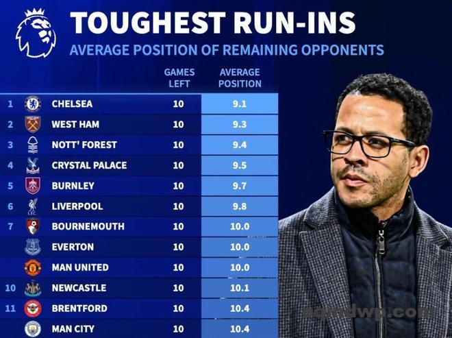 北京时间3月3日,德转统计出了本赛季英超剩余10轮各支球队将会遭遇的对手在联赛中的平均排名,切尔西最后10个对手平均排名9.1位,为所有球队最高,而领头羊阿森纳剩余9个对手的平均排名仅为11.6位,位列倒数第三。
