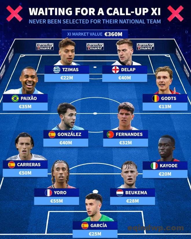 北京时间11月16日,德转列出了从未入选过国家队的11人阵容,其中包括了切尔西的德拉普、曼城的尼科-冈萨雷斯、皇家马德里的阿尔瓦罗-卡雷拉斯、曼联的约罗以及巴塞罗那的霍安-加西亚。