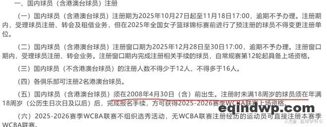 不过,遗憾的是,从篮协这一次新赛季规定来看,他们并没有更改的意思,WCBA新赛季依旧要达到年满18岁,才可以登场比赛。即2008年4月30日以前出生的球员,才允许被注册成功。而2008年5月份以后出生的球员,他们则无法被注册。另外,即便是2008年4月30日以前出生的球员,他们想要登场比赛,也需等到年满18岁,才可以正式注册成功。