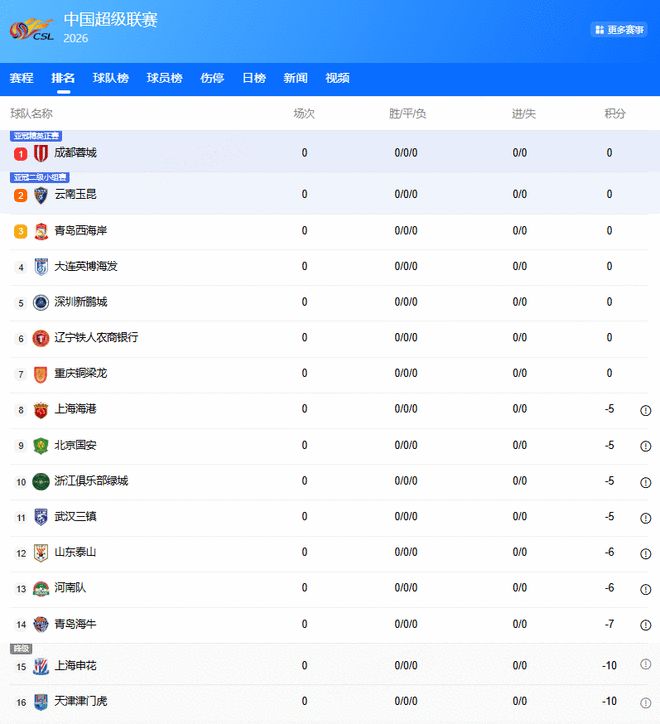 新赛季开始前,16支中超球队中有多达9支被罚分。这也让中超积分榜罕见的出现了大面积“负分”情况:中超四冠王上海海港,第八开局;加冕了足协杯、超级杯双料冠军的国安,第九起跑;所有拿过中超冠军的球队,都在下半区才能看到那熟悉的身影。