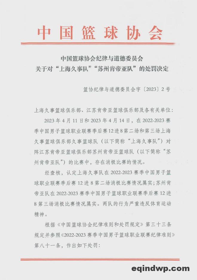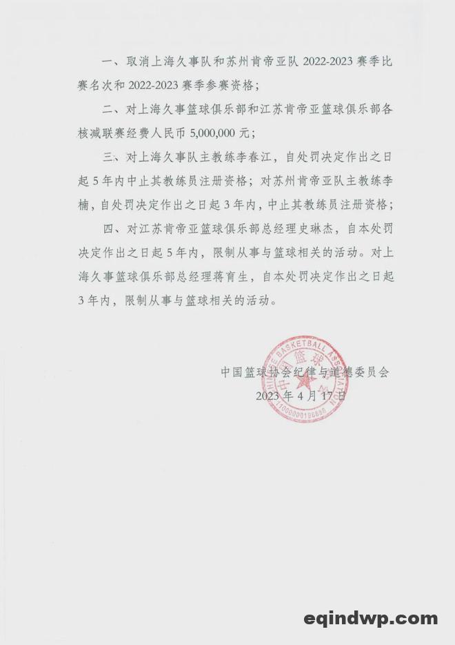 时间回到2023年4月17日,中国篮协开出一份重磅罚单:取消上海男篮和江苏男篮在2022-23赛季的CBA联赛比赛名次和参赛资格, 上海男篮和江苏男篮各自被罚500万元。
