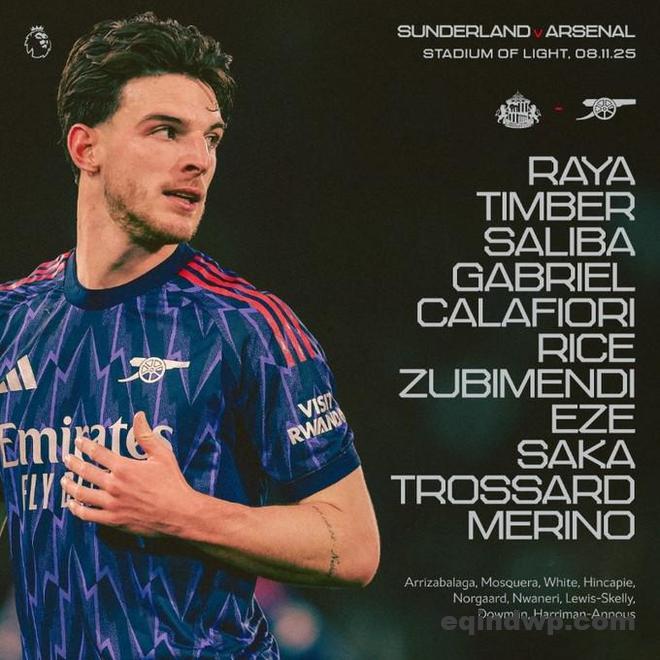 阿森纳首发:1-戴维-拉亚、12-廷贝尔、2-萨利巴、6-加布里埃尔、33-卡拉菲奥里、41-赖斯、36-苏比门迪、10-埃泽、7-萨卡、19-特罗萨德、23-梅里诺