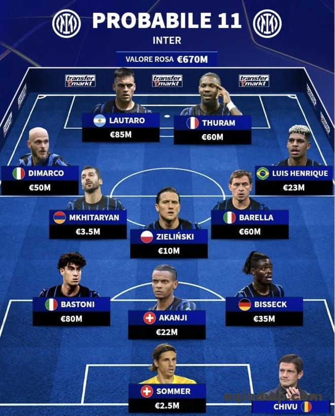 国际米兰 | 预测首发11人(阵容身价:6.7亿欧元)