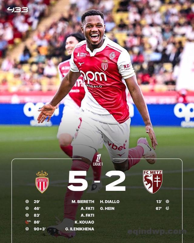 客队在第67分钟通过点球扳平了比分,但法蒂再次为摩纳哥队取得领先,这次他用头球完成了破门。新上场的球员将一个传中球送入禁区核心,而这位身穿31号球衣的球员再次让梅斯的防守感到惊讶,他的头球对于守门员费舍尔来说无法阻挡。
