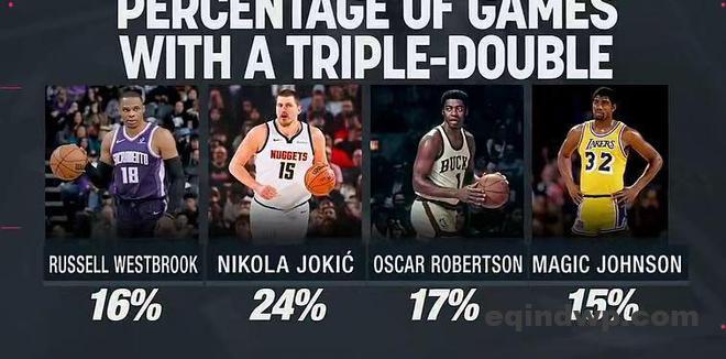 约基奇本赛季21次三双高居联盟第一,生涯185次三双历史第二,仅次于威少207次三双,生涯三双率高达24%。