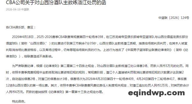 其次,依照本赛季CBA联赛赛风赛纪责任人制度相关规定,对潘江追加处罚1万元,对其罚款合计6万元,罚款的缴纳按照《纪律准则》第一章第十三条之规定办理。