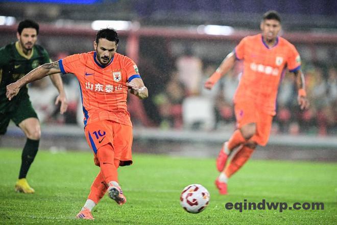 10月18日,山东泰山队球员卡扎伊什维利(前)在比赛中主罚点球。 当日,在2025赛季中国足球超级联赛第27轮比赛中,浙江俱乐部绿城队主场2比2战平山东泰山队。 新华社记者 江汉 摄