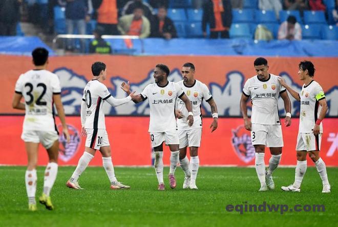 10月17日,上海海港队球员在比赛中庆祝进球。 当日,在山东青岛举行的2025赛季中超联赛第27轮比赛中,上海海港队客场4比3战胜青岛海牛队。 新华社记者 李紫恒 摄