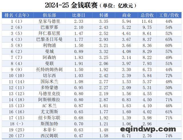 1月21日,德勤会计师事务所发布2024-25赛季金钱联赛报告,收录了上赛季世界足坛营收金额前20名俱乐部(以下简称“二十强”)的财政数据。