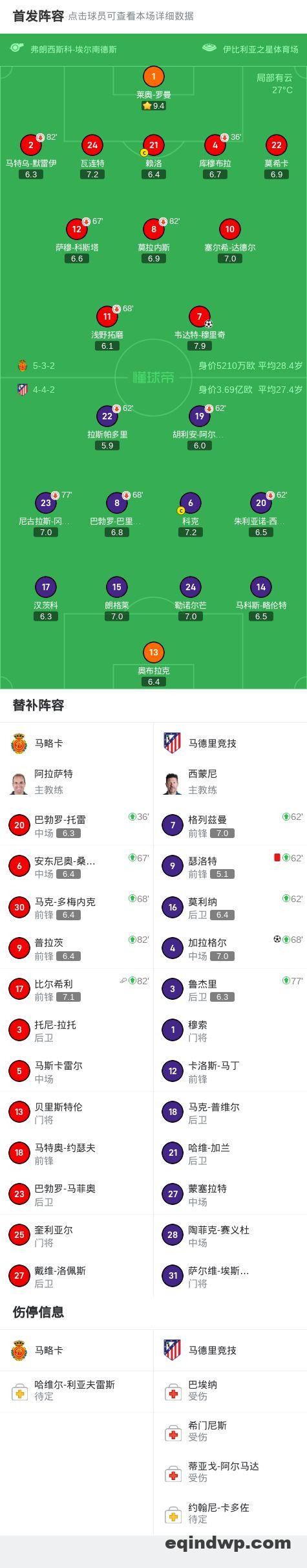 北京时间9月21日西班牙足球甲级联赛 联赛 第5轮,马略卡主场对阵马德里竞技。马略卡韦达特-穆里奇破门。马德里竞技加拉格尔破门。最终比分马略卡 11 马竞。