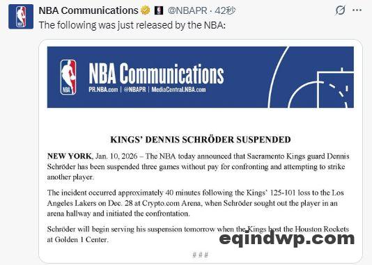北京时间1月11日,NBA官方今日宣布,萨克拉门托国王队后卫丹尼斯-施罗德因与另一名球员发生对峙并试图动手击打对方,被处以禁赛三场且无薪的处罚。