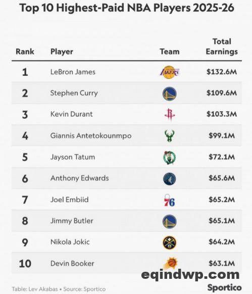 北京时间2月21日,美媒Sportico公布2025-26赛季NBA总收入(NBA年薪+场外代言收入)最高前十球员榜单,詹姆斯以1.326亿美元高居榜首,库里与杜兰特分列二三位,他们也是仅有的3位超过1亿美元收入球员。