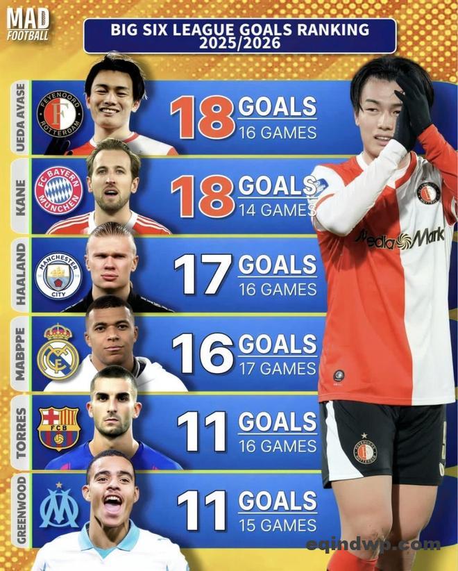 数据图最近MAD FOOTBALL发布了“欧洲六大联赛进球排名(2025/2026)”,数据截至撰文时间(北京时间2025年12月16日)。榜单里凯恩、哈兰德、姆巴佩这些熟脸都在,但最抢眼的还是上田绮世,直接冲到并列第一。托雷斯和格林伍德也没掉队,第二梯队咬得很紧。反过来,萨拉赫、莱万多夫斯基这类常年高产的名字,这次却没出现在这张榜单里,悬念一下就出来了。