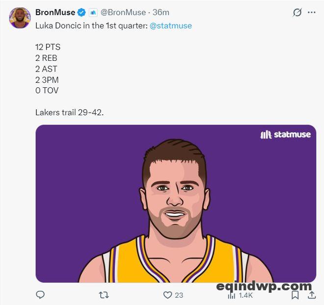 第三节开场仅仅5分钟,东契奇5中4,三分4中3连取11分1篮板2抢断帮助湖人完成反超。东契奇又现惊魂一幕,阿德巴约直接骑到了东契奇的背上,东子的腰部明显不适但他没有申请下场,三节打完东契奇24中13,三分14中7,拿到40分6篮板3助攻4抢断,单节拿到19分。
