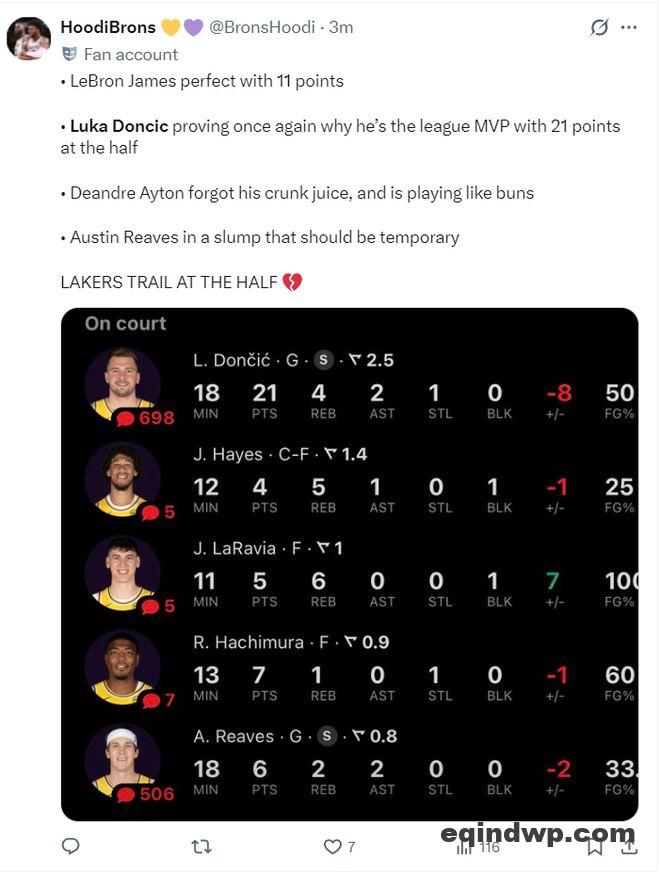 第二节的东契奇比首节还准,单节6分钟里7中4,三分2中1,拿到9分2篮板1抢断,东契奇的爆炸就是湖人将15分缩小到个位数的关键,东契奇半场18分钟拿到21分4篮板2助攻1抢断,命中率50%。