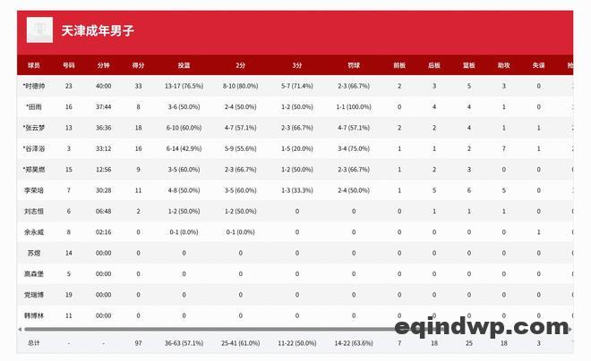 天津男篮时德帅33分5板3助,张云梦18分4板1助;北京男篮翟晓川19分8板2助,张帆18分1助。