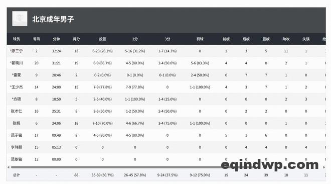 北京男篮:翟晓川19分8板2助,张帆18分1助1断,王少杰15分7板1助,廖三宁13分5板10助,范子铭8分6板,张才仁8分2板,方硕5分2助。