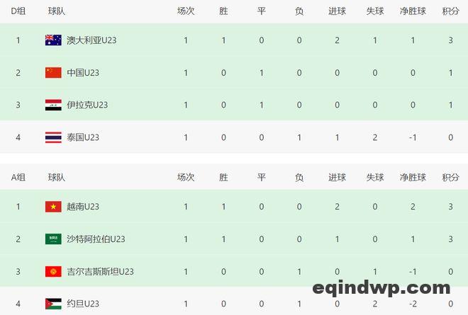 北京时间1月8日晚上,2026年U23亚洲杯正赛首轮继续进行,D组两场比赛,中国男足0-0打平伊拉克男足、澳大利亚男足2-1逆转泰国男足。最新积分榜,澳大利亚队排名第一,中国队和伊拉克队并列第二,泰国队沦为垫底。
