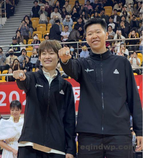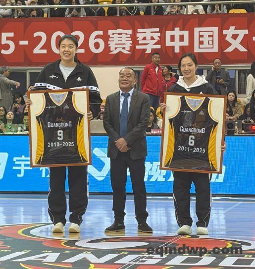 广东女篮功勋老将沈怡和于东领取总冠军戒指,并领取退役球衣。