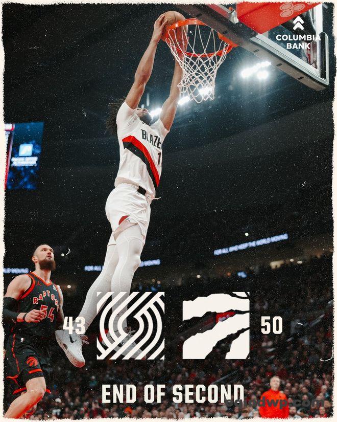 猛龙队的奎克利上半场得到11分和5个篮板,马姆科拉什维利得到11分;开拓者队的夏普得到13分,克林根得到4分和10个篮板,杨瀚森抢到3个篮板。