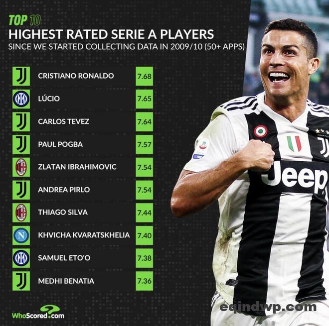 近期WhoScored公布的意甲高分榜单中,第一名是C罗,这个结果争议不大。他在尤文图斯的意甲数据非常扎实:98场比赛贡献81个进球和15次助攻。凭借极强的终结能力和稳定的输出,他将平均评分拉到了7.68分,完全具备说服力。紧随其后的卢西奥和特维斯同样是依靠实打实的表现入围的。文中原数据的卢西奥意甲126次出场有误,实际上卢西奥在国际米兰共出战了96场意甲联赛(各项赛事总计136场),他是球队巅峰时期的后防绝对核心;特维斯效力尤文两个赛季,意甲66场打进39球,其中2014/15赛季单季轰入20球。这种对比赛的直接干预能力,在评分模型中很容易拿到高分。