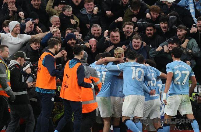 曼城在第84分钟扳平比分!哈兰德头球摆渡到门前,伯纳多-席尔瓦跟上倒地铲射,球进了!这粒进球非常关键,极大地提升了曼城球员的士气。补时阶段,阿利松送点。哈兰德主罚点球,他推射破门,完成绝杀!哈兰德怒吼脱衣庆祝!最后时刻索博斯洛伊因为犯规被罚下。最终,曼城上演奇迹逆袭,2-1击败卫冕冠军利物浦。