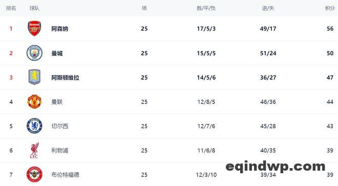 在积分榜上,阿森纳依然占据榜首位置:17胜5平3负,拿到56分。而曼城赢下这场关键比赛之后,总积分达到50分,排名第2,与阿森纳有6分的差距。冠军的争夺还是有一定的悬念,只是曼城想要追上去难度不小。阿斯顿维拉掉队了,只拿到47分,排名第3,与阿森纳有9分的差距。曼联的一波连胜让其稳居第4名,拿到44分。切尔西拿到43分紧随其后,排名第5。利物浦输球之后,依然是39分,排名第6,与欧冠区的曼联有5分的差距。布伦特福德也是39分,排名第7。