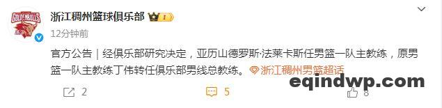 如今浙江男篮官方公告写道:“官方公告|经俱乐部研究决定,亚历山德罗斯-法莱卡斯任男篮一队主教练,原男篮一队主教练丁伟转任俱乐部男线总教练。”