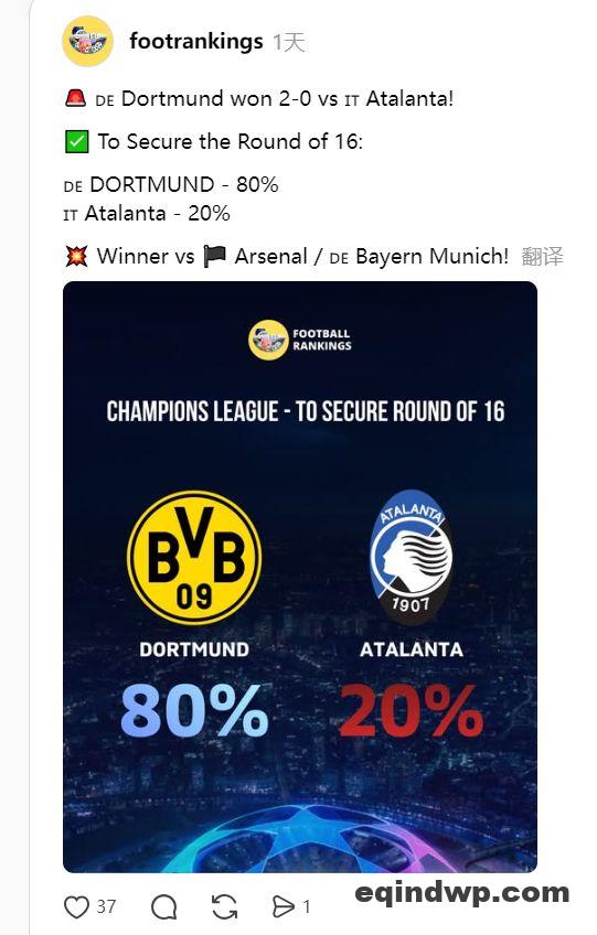 相比于尤文图斯、国际米兰的破罐破摔式摆烂,亚特兰大客场0-2输给多特蒙德显得毫无波澜。对于次回合的展望,虽然多特蒙德并非以防守稳固著称,但亚特兰大也早已不是当年加斯佩里尼治下那支进球如砍瓜切菜的球队。该队的欧冠历史全部集中在2019-20赛季之后,总主场成绩是6胜7平7负,得失球30-29,完全看不出来有逆转的机会。