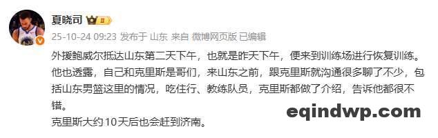 根据夏晓司的报道,鲍威尔自称和克里斯是哥们,来山东之前,他就跟克里斯有过沟通,了解了山东男篮的情况,以及吃住行、教练球员等。