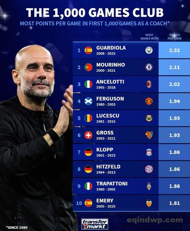北京时间11月11日,在瓜迪奥拉达成教练生涯1000场里程碑之后,德转统计出了自1980年以来,执教俱乐部前1000场正式比赛场均积分排名前10的主教练,瓜迪奥拉以2.32分排名第一,穆里尼奥第二,安切洛蒂第三。