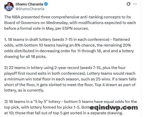 北京时间3月27日,据名记Shams报道,ESPN消息源透露,NBA已于昨日向联盟理事会提交了三套全面的反摆烂改革方案,预计每项方案都会在5月正式投票前进行调整。