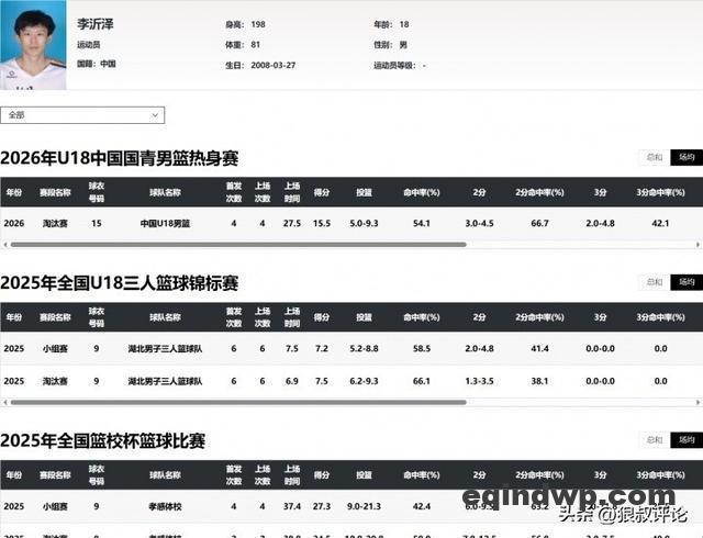 2005年出生的杨瀚森,19年跟随淄博体校征战U15,21、22年U17,22年U18亚锦赛,23年U19世界杯都是有清晰比赛记录在册的。23-24赛季、24-25赛季杨瀚森在经过2个赛季的CBA征战之后,于2025年开始冲击NBA,如今已经在NBA度过了一个完整的2025-26赛季。