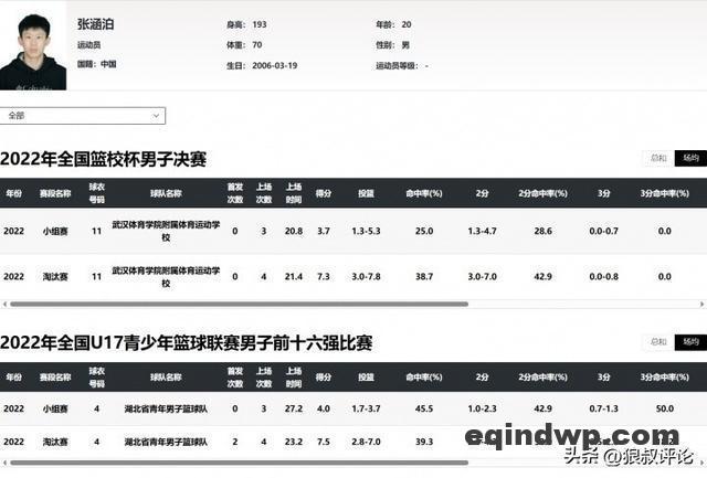 网友晒出了两人的参赛信息,张涵泊,2006年生,湖北青年男篮、武汉体育学院附属体校球员,2021-2022年U15/U17赛事参赛。